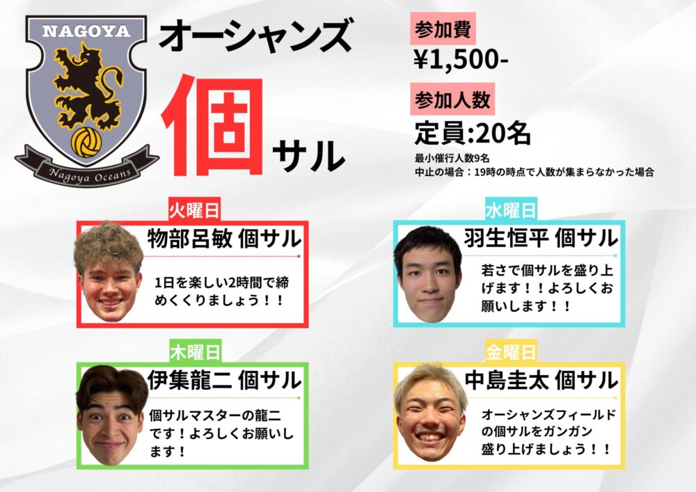 2026-2027 シーズン 個サル担当選手決定!!未分類投稿日:2026.04.142026-2027シーズン オーシャンズ個サルの担当選手が決定いたしました。日程:毎週火〜金曜日(20:00〜22:00)場所:オーシャンズフィールド室内コート火曜日:物部呂敏水曜日:羽生恒平木曜日:伊集龍二金曜日:中島圭太選手のコンディションや試合日程の都合により、担当が変更する場合がございます。シューズは屋内用シューズ(いぼ付き不可)の着用をお願いいたします。